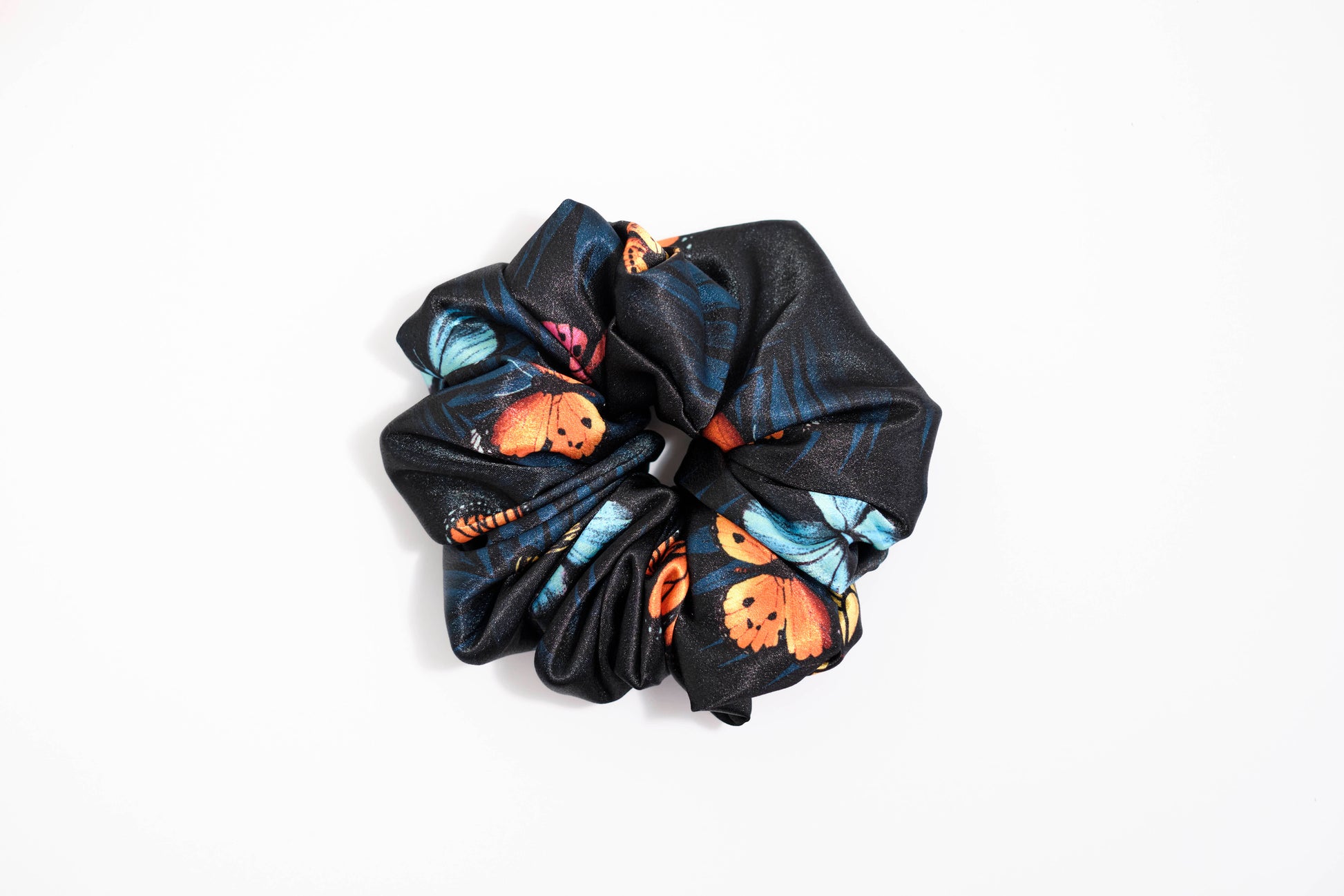 Dark Floral & Butterfly Print Scrunchie (Valentino) - Elegant Satin Hair Tie
