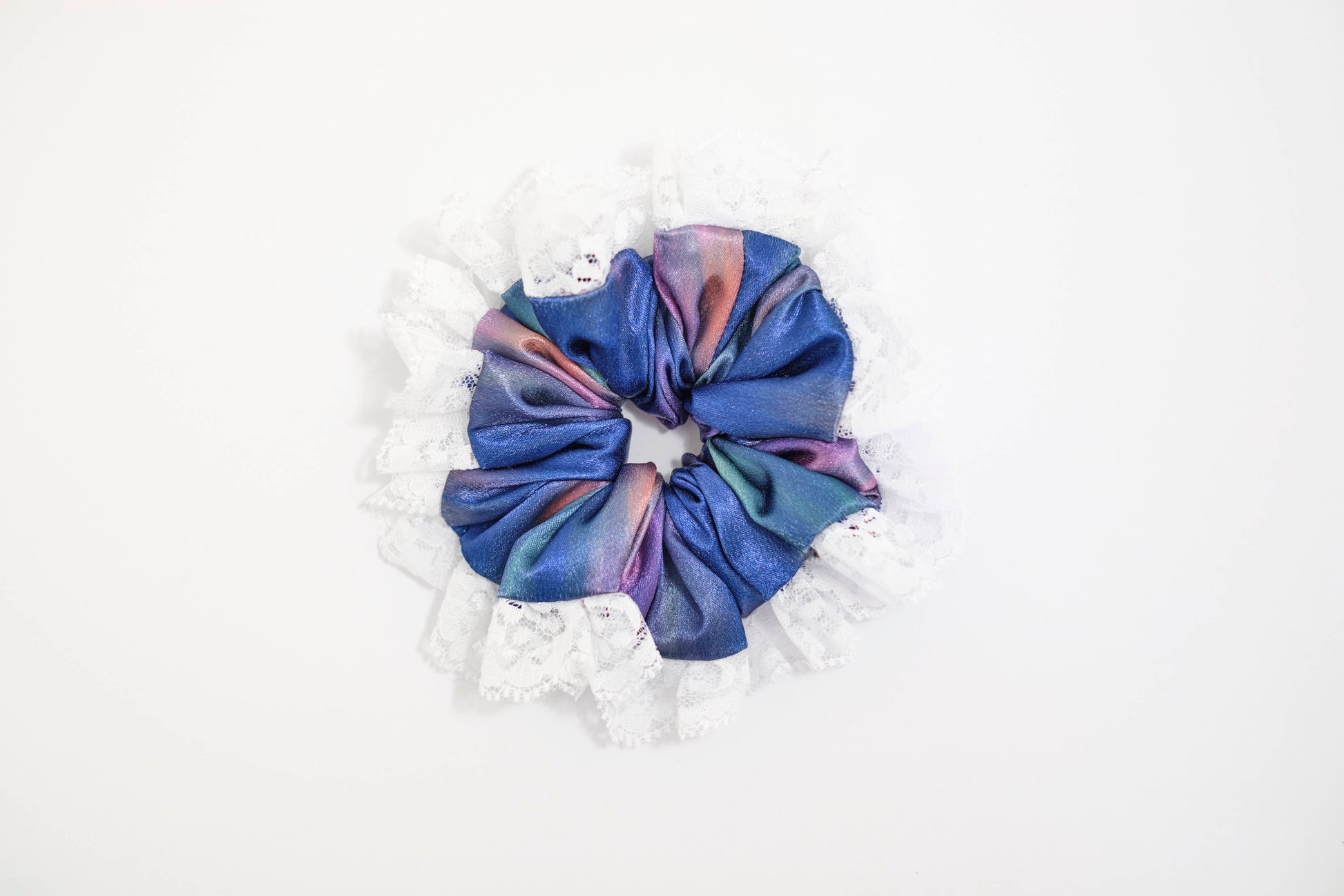 Iridescent Blue & Purple Scrunchie with White Lace Trim - Holographic Hair Tie