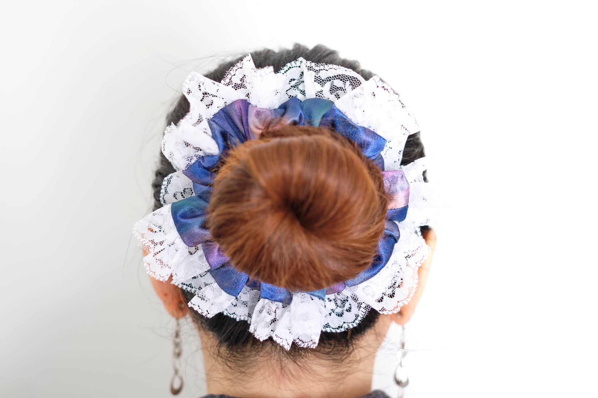 Add a touch of magical elegance to your hairstyle with this iridescent blue and purple scrunchie featuring delicate white lace trim. This holographic hair tie shimmers with captivating color shifts, enhanced by the soft, vintage-inspired lace. Perfect for creating stylish ponytails, buns, and other updos, this unique accessory is ideal for adding a special touch to any look.