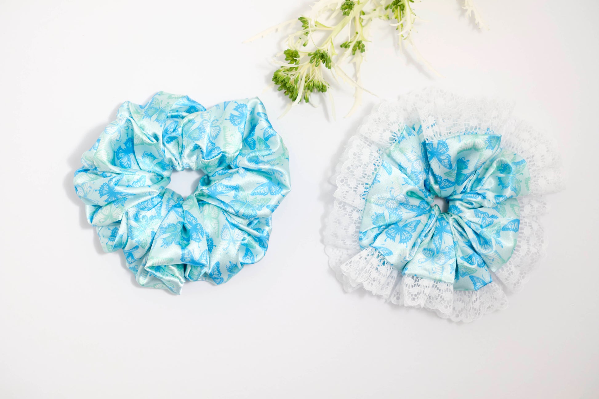 Light Blue Floral Print Scrunchie - Delicate Flower Hair Tie