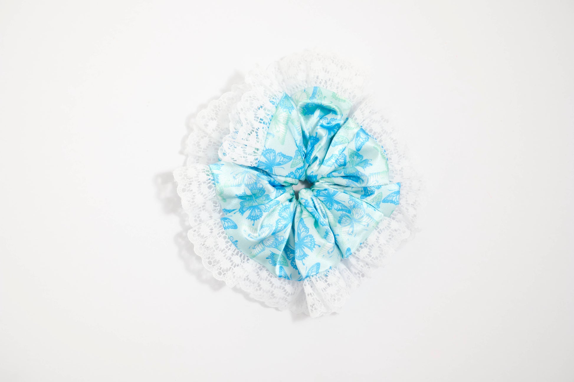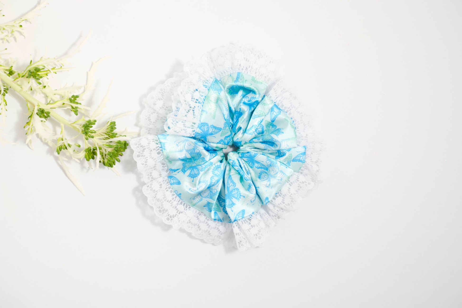 Light Blue Floral Scrunchie with White Lace Trim - Elegant Hair Tie
