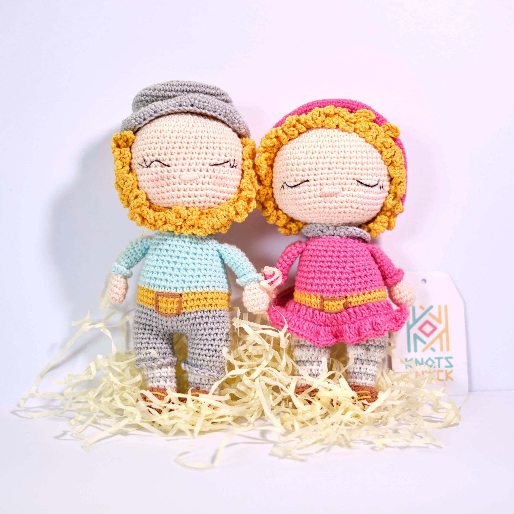 Bring a touch of whimsical charm with this set of two mini crochet gnome dolls. Lovingly handcrafted, this adorable gnome couple features unique details and makes a delightful addition to your shelf decor or a sweet handmade gift.